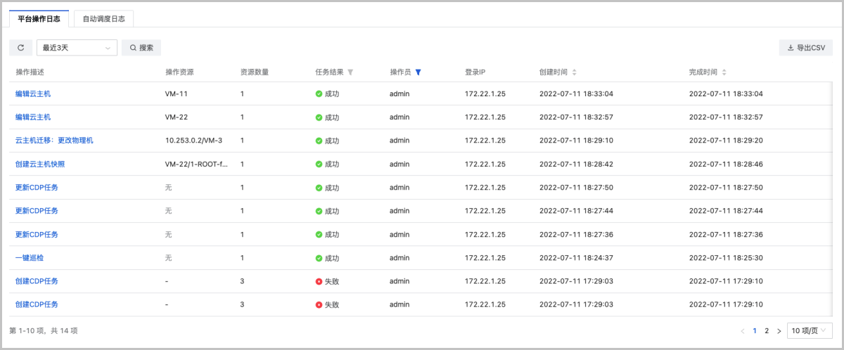 操作日志包括平台操作日志和自动调度日志两个子页面。可通过快速查看云平台操作日志,结合云平台审计功能进行细粒度操作追踪与问题排查,进一步提高运维效率。