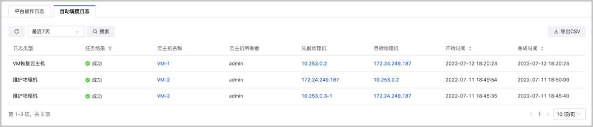 自动调度日志界面显示管理节点主动触发的云主机调度日志,如云主机高可用、维护物理机。支持查看日志类型、任务结果、云主机名称、云主机所有者、先前物理机、目标物理机、开始时间和完成时间,进一步丰富运维场景,便于审计和追溯。