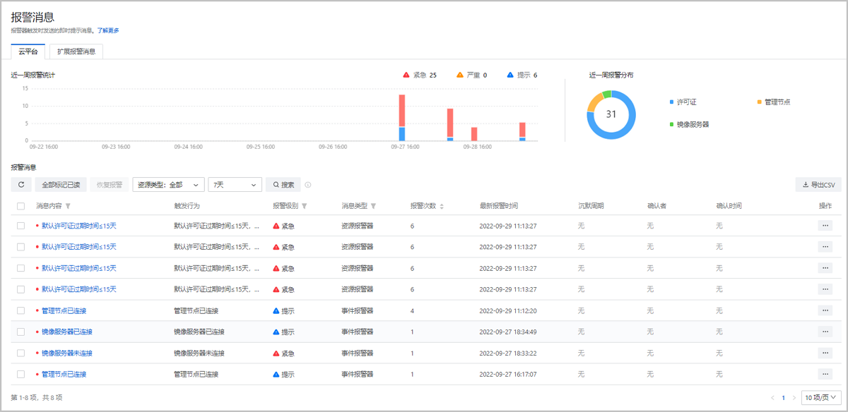 • 报警消息列表:可查看最多1000条报警消息,并以消息内容进行分类,用户可按资源类型和时间进行筛选。支持对报警消息设置沉默周期、恢复报警以及全部标记已读。