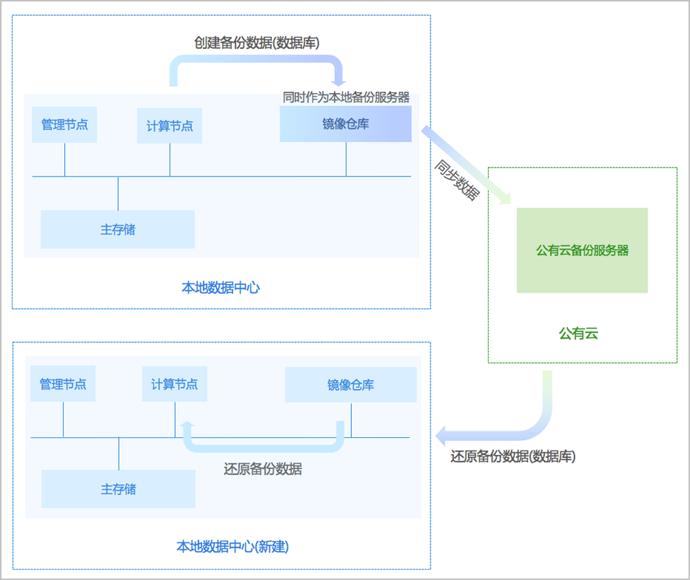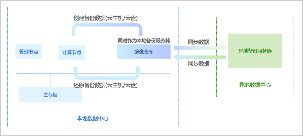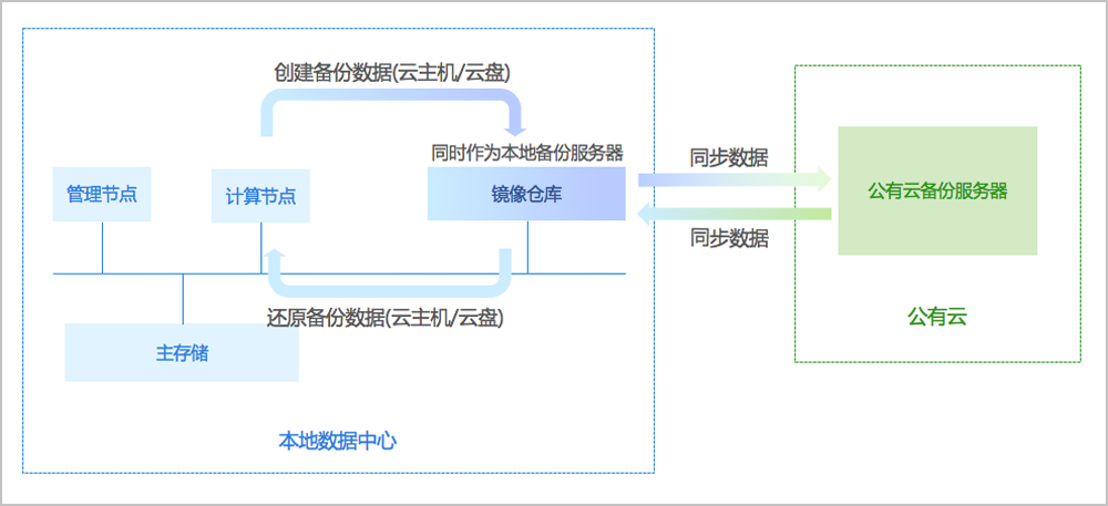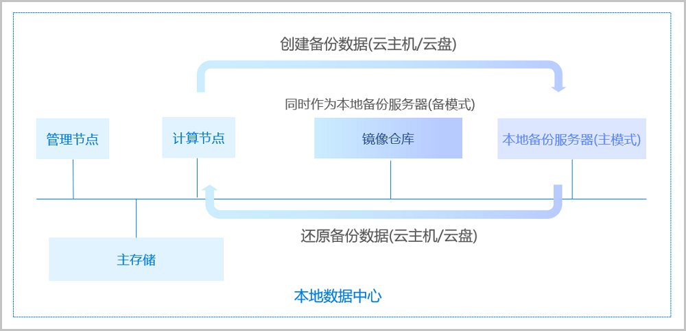 支持将本地部署的镜像仓库作为本地备份服务器,用于存放本地云主机/云盘/管理节点数据库(简称数据库)的定时备份数据。同时本地备份服务器支持主备无缝切换,有效保障业务连续性。
