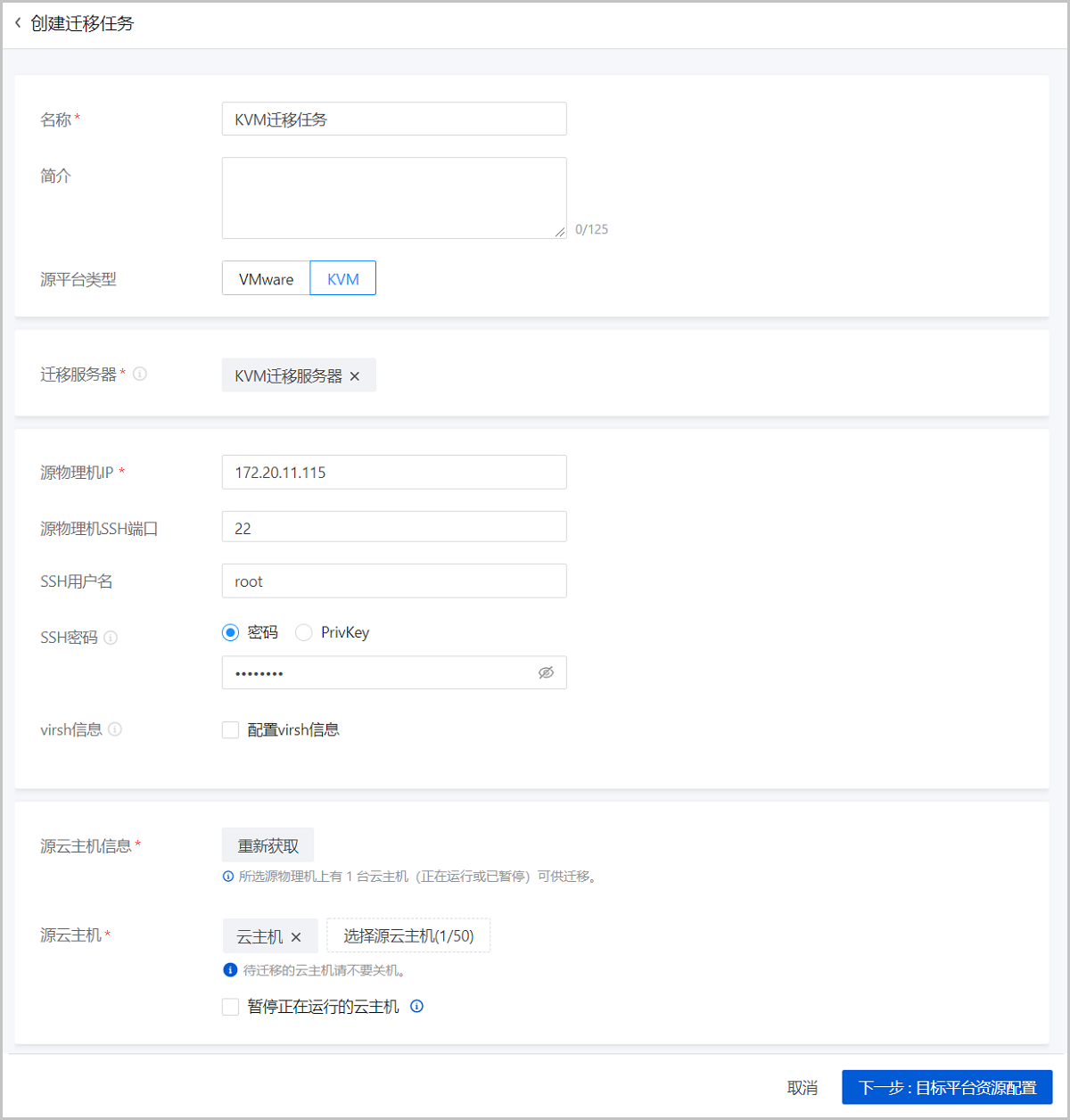 基于KVM源平台类型创建迁移任务