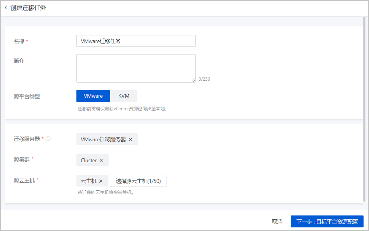 • 源平台类型:选择源平台的类型,此场景选择VMware作为源平台类型
