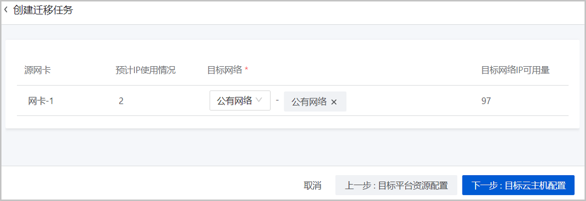 2. 若所选源云主机中存在未配置网卡的云主机:需进入下一步手动配置目标网卡。