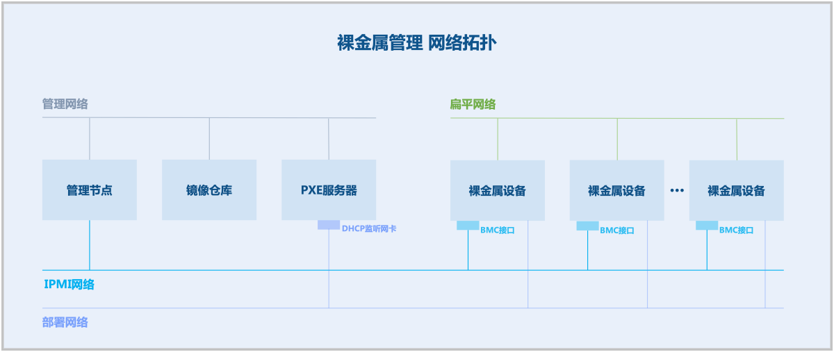 裸金属管理服务的基本原理:部署服务器提供DHCP服务和FTP服务,指示多台裸金属设备由PXE网卡启动并分配动态IP,裸金属设备从部署服务器中下载相关软件包,用于裸金属主机的系统安装。