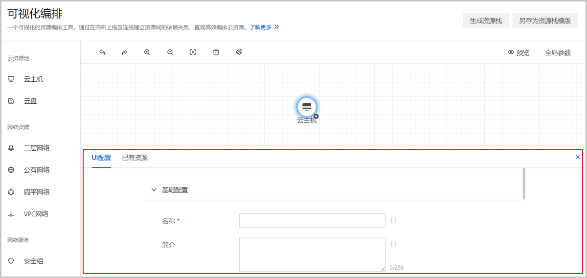 使用可视化编排,可以更直观高效地创建资源栈模板以及显示资源栈结构。打开可视化编排,通过拖曳资源到画布中适当位置,连线创建资源间的依赖关系,并输入需要的参数,即可快速创建资源栈模板,高效编排云资源。